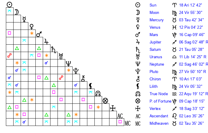 Sun | 18 Aries 12 | 19 Aries 6 | 10 Gemini 32 |