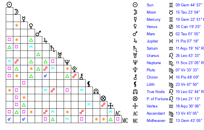 | Neptune | 11 Scorpio 22 | 1 Aries 51 | 10 Scorpio 44 |