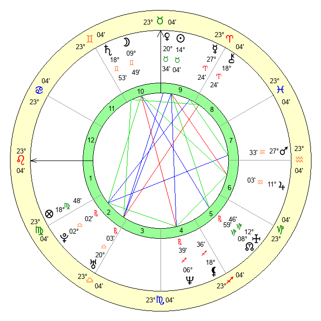 | Moon | 9 Gemini 46 | 16 Leo 8 | 27 Aries 44 |