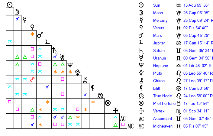 | Moon | 26 Capricorn 14 | 23 Aries 41 | 27 Capricorn 26 |