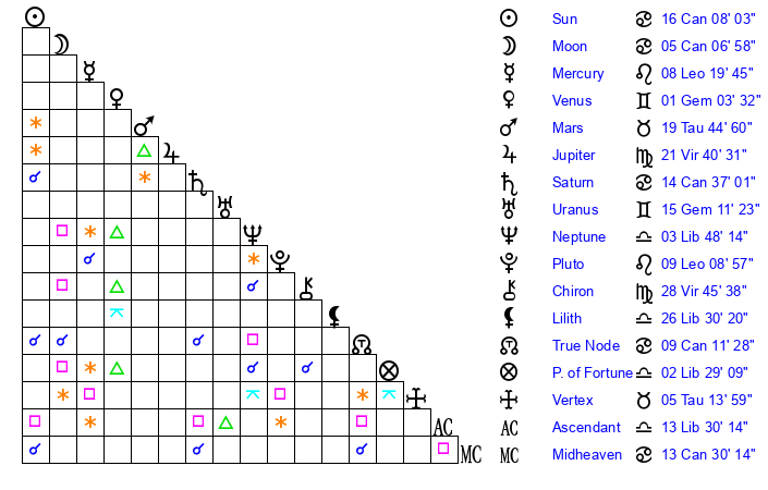 | Moon | 5 Cancer 0 | 21 Sagittarius 46 | 10 Gemini 15 |