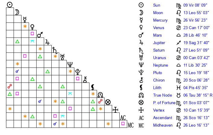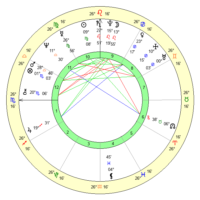 | Saturn | 28 Leo 17 | 29 Pisces 51 | 5 Virgo 53 |
