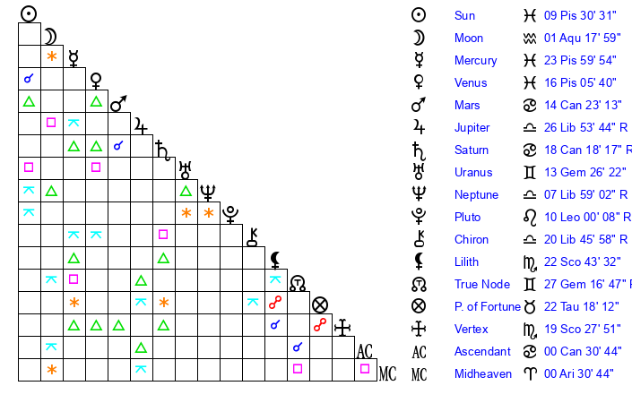 | Sun | 9 Pisces 31 | 10 Pisces 21 | 27 Taurus 8 |