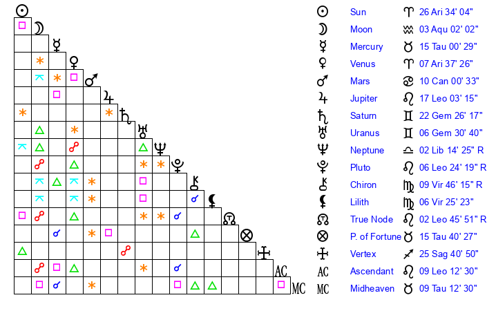 | Sun | 26 Aries 34 | 26 Aries 57 | 14 Cancer 28 |