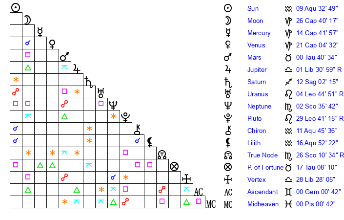 | Moon | 26 Capricorn 34 | 12 Aquarius 20 | 15 Cancer 47 |
