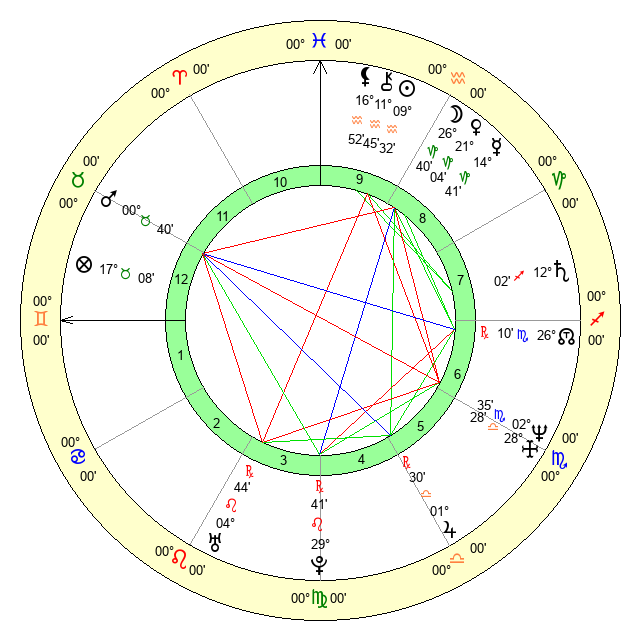 | Sun | 9 Aquarius 32 | 10 Aquarius 2 | 17 Aries 36 |