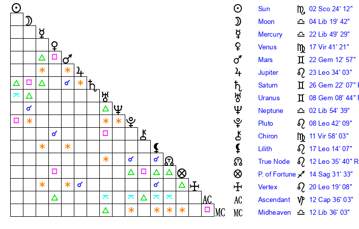 | Neptune | 2 Libra 56 | 29 Pisces 53 | 4 Libra 14 |