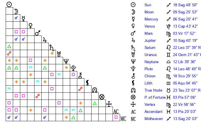 | Sun | 18 Sagittarius 49 | 19 Sagittarius 54 | 8 Pisces 1 |