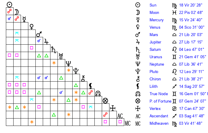 | Mercury | 15 Virgo 25 | 17 Virgo 38 | 21 Scorpio 20 |