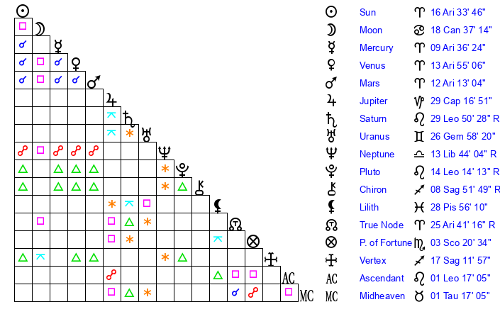 | Sun | 16 Aries 34 | 17 Aries 8 | 29 Gemini 58 |