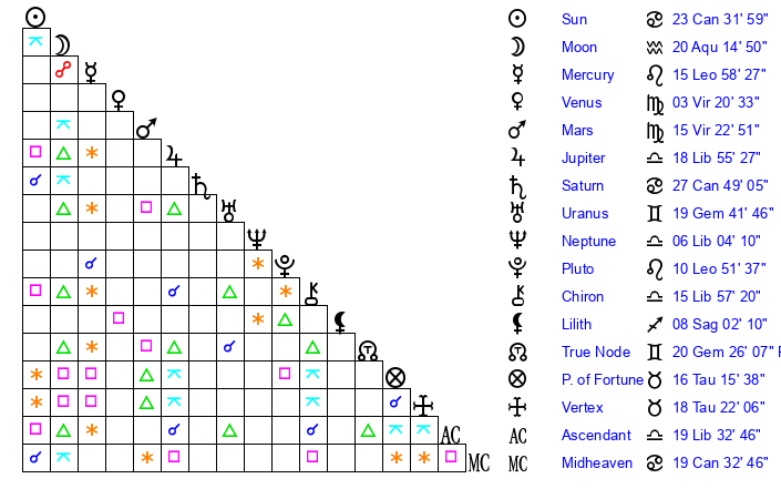 | Moon | 20 Aquarius 20 | 7 Aries 7 | 13 Capricorn 7 |