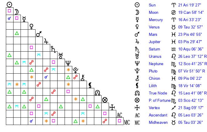 | Sun | 21 Aries 19 | 22 Aries 3 | 22 Gemini 11 |