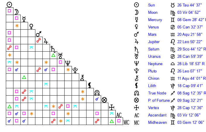 | Pluto | 26 Leo 6 | 3 Aquarius 46 | 27 Leo 26 |