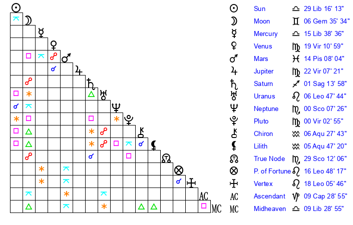| Moon | 6 Gemini 29 | 12 Scorpio 33 | 23 Sagittarius 27 |