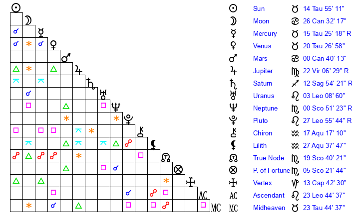 | Sun | 14 Taurus 55 | 15 Taurus 27 | 20 Cancer 3 |