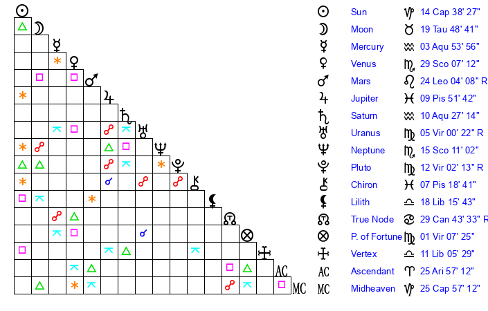 | Pluto | 12 Virgo 2 | 1 Aquarius 12 | 10 Virgo 42 |