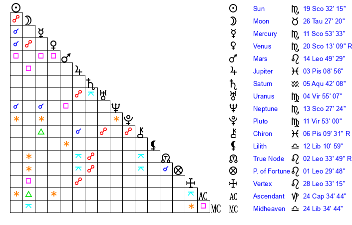 Sun | 19 Scorpio 32 | 20 Scorpio 31 | 22 Capricorn 30 |