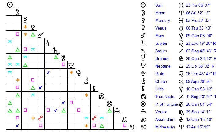 | Sun | 23 Pisces 6 | 23 Pisces 22 | 0 Gemini 35 |