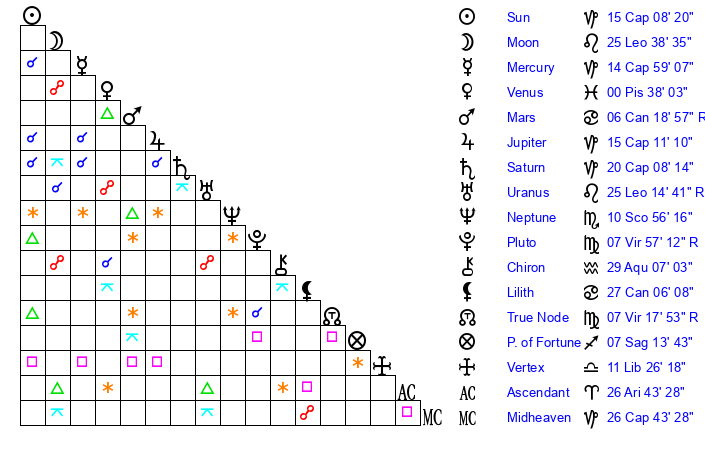 | Moon | 25 Leo 38 | 16 Leo 8 | 11 Capricorn 44 |
