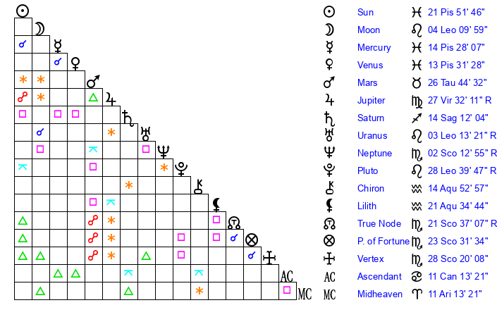 | Sun | 21 Pisces 51 | 22 Pisces 22 | 28 Taurus 26 |