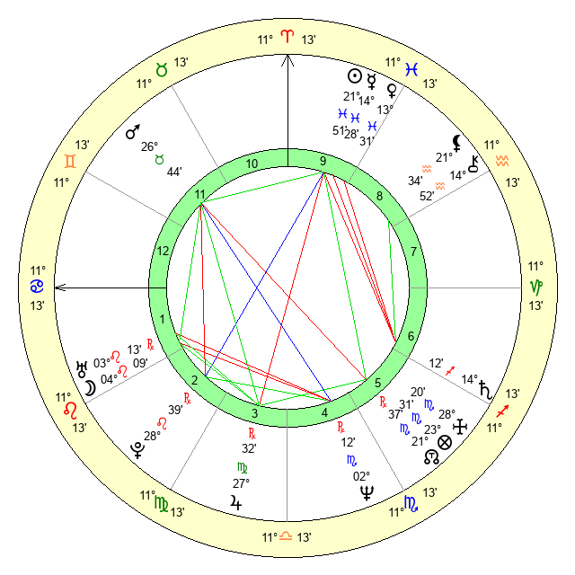 | Moon | 4 Leo 24 | 4 Virgo 33 | 6 Aquarius 23 |