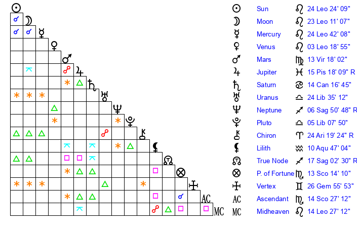Mercury | 24 Leo 42 | 6 Leo 39 | 8 Scorpio 37 |