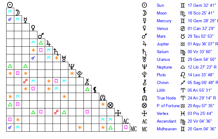 | Sun | 17 Gemini 33 | 18 Gemini 9 | 0 Virgo 13 |