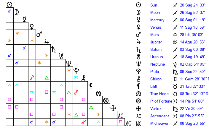 | Moon | 26 Sagittarius 55 | 12 Taurus 20 | 27 Taurus 53 |