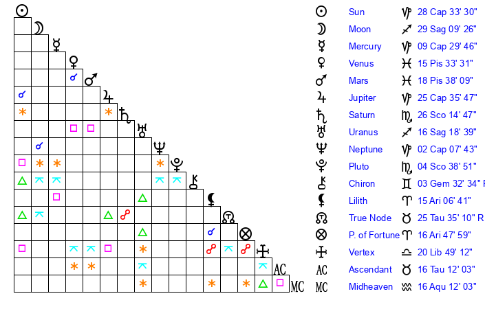 | Saturn | 26 Scorpio 31 | 15 Pisces 59 | 28 Scorpio 21 |