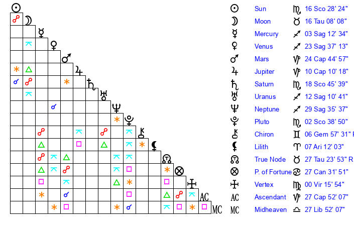 | Moon | 16 Taurus 14 | 0 Cancer 56 | 21 Scorpio 47 |