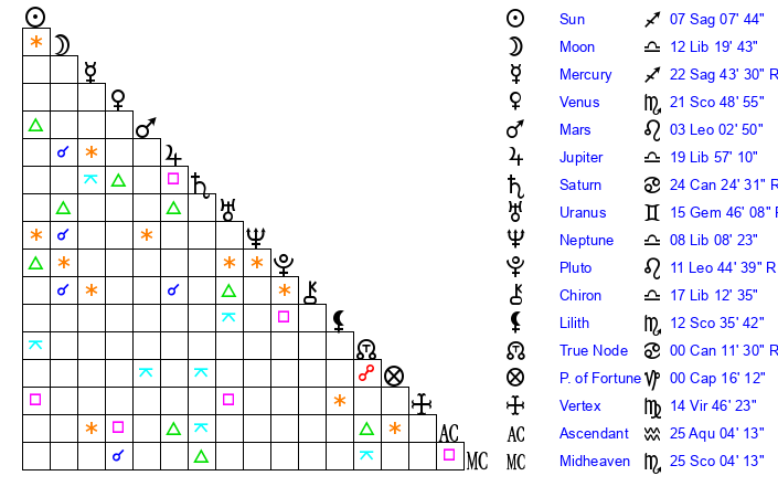 | Moon | 12 Libra 20 | 25 Pisces 25 | 16 Virgo 52 |