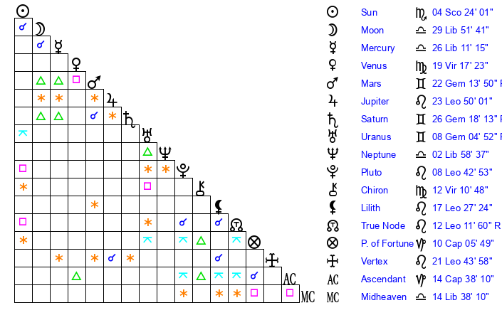 | Neptune | 3 Libra 0 | 29 Pisces 51 | 4 Libra 13 |
