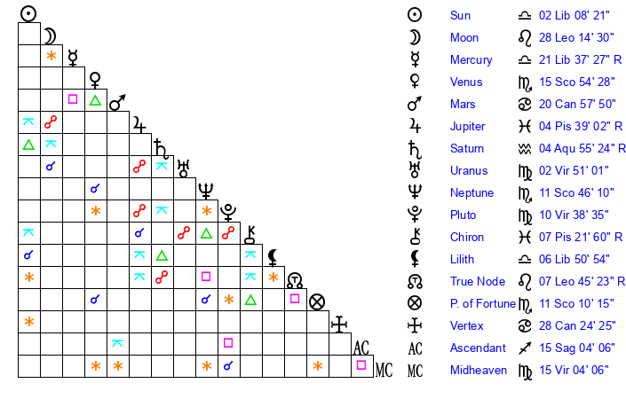 | Venus | 15 Scorpio 54 | 7 Virgo 34 | 12 Scorpio 53 |