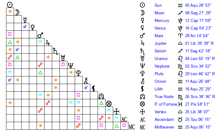 | Sun | 5 Aquarius 29 | 5 Aquarius 59 | 13 Aries 40 |