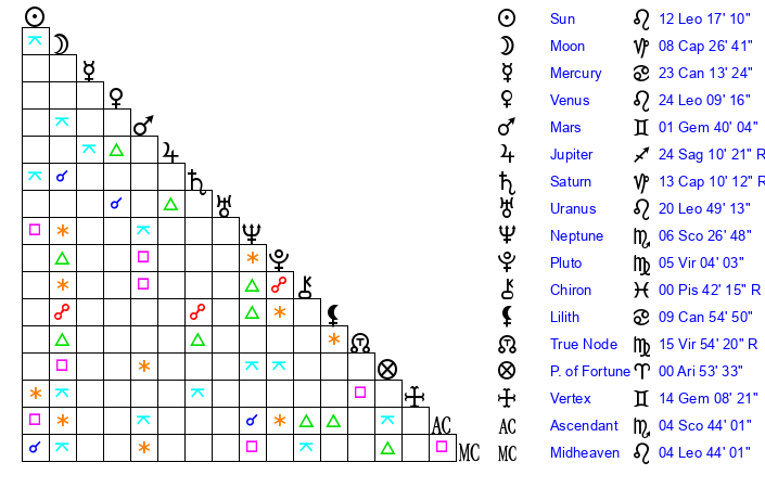 | Venus | 24 Leo 10 | 5 Cancer 16 | 14 Scorpio 6 |