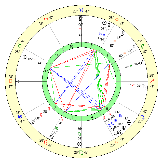 | Moon | 5 Gemini 38 | 20 Aquarius 31 | 0 Sagittarius 11 |