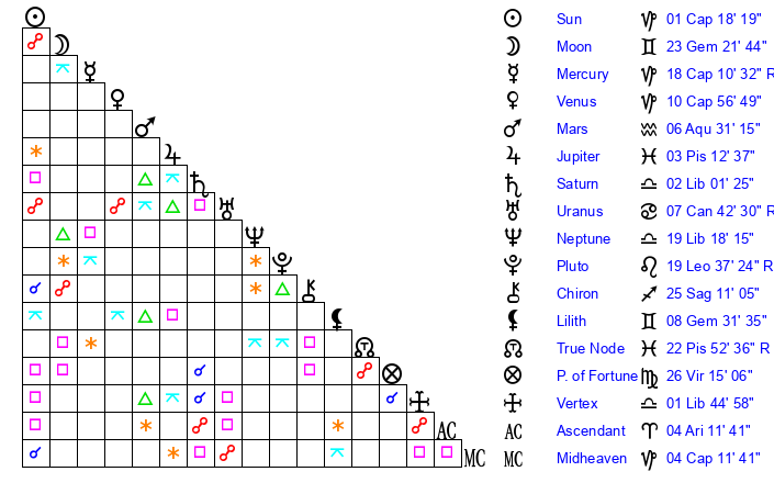 | Sun | 1 Capricorn 18 | 2 Capricorn 7 | 17 Pisces 19 |