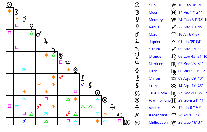 | Mars | 16 Aries 57 | 17 Capricorn 4 | 29 Taurus 14 |