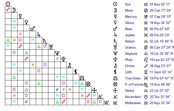 | Moon | 26 Cancer 20 | 12 Scorpio 2 | 18 Aries 56 |