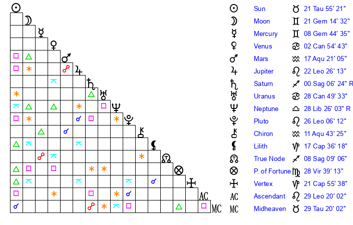 | Moon | 21 Gemini 16 | 22 Scorpio 14 | 4 Capricorn 4 |