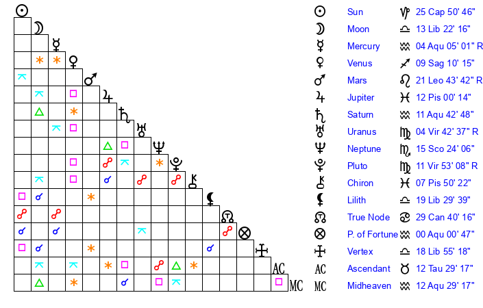 | Moon | 13 Libra 19 | 0 Virgo 4 | 12 Capricorn 13 |