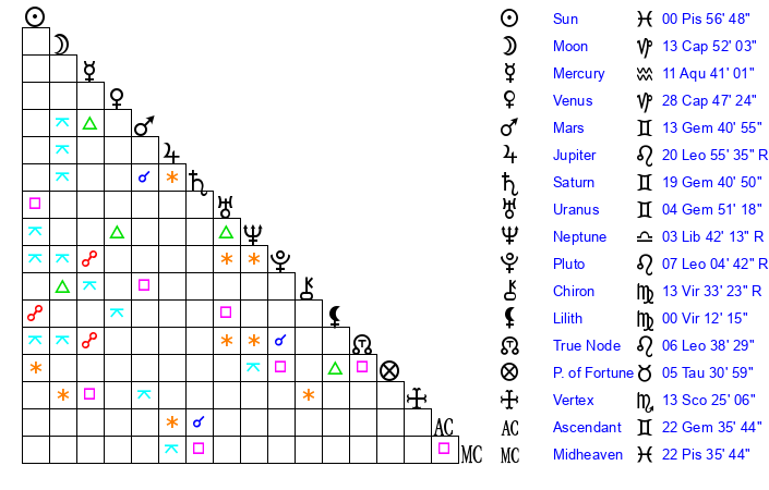 | Sun | 0 Pisces 57 | 2 Pisces 18 | 20 Taurus 51 |