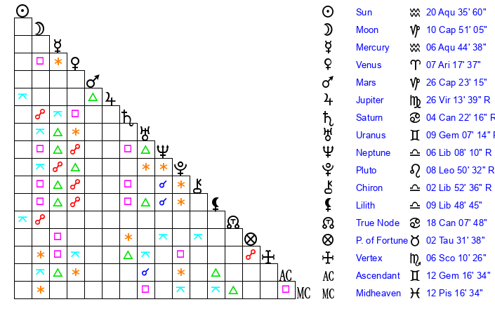 | Moon | 10 Capricorn 51 | 16 Cancer 46 | 16 Sagittarius 18 |