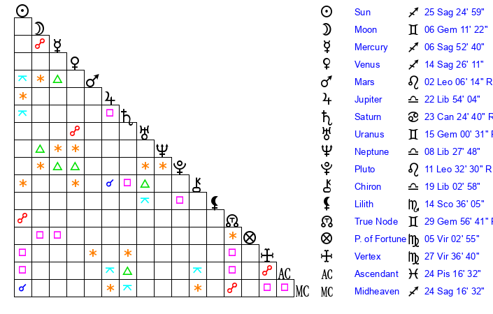 | Saturn | 23 Cancer 51 | 25 Pisces 24 | 18 Cancer 32 |