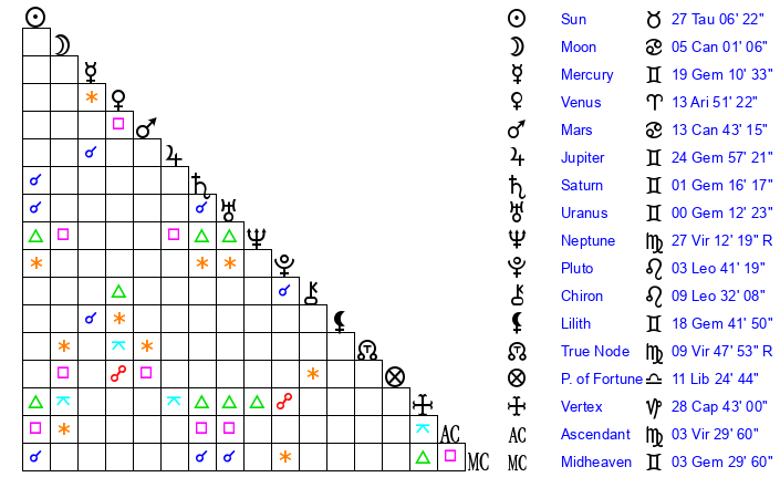 | Saturn | 1 Gemini 30 | 29 Pisces 23 | 10 Gemini 54 |