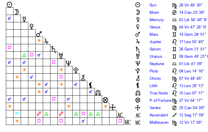 | Mars | 14 Gemini 28 | 0 Scorpio 15 | 9 Gemini 50 |
