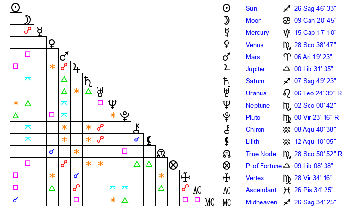 | Sun | 26 Sagittarius 46 | 27 Sagittarius 1 | 6 Pisces 50 |