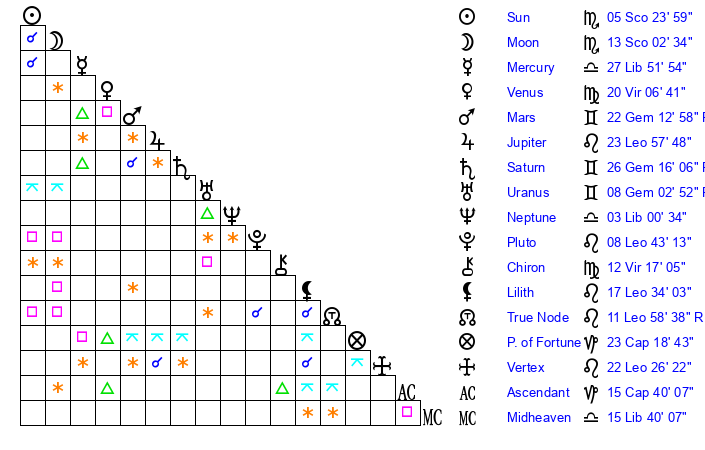 | Moon | 13 Scorpio 4 | 6 Aquarius 51 | 10 Scorpio 45 |