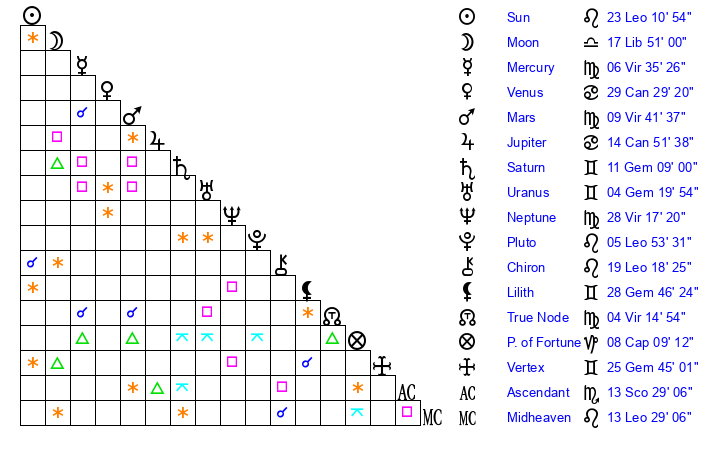| Sun | 23 Leo 10 | 24 Leo 5 | 14 Scorpio 39 |