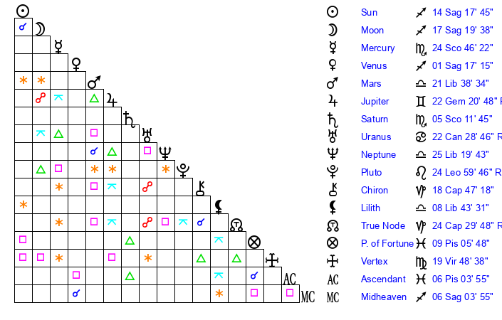 | Sun | 14 Sagittarius 17 | 14 Sagittarius 49 | 27 Aquarius 30 |